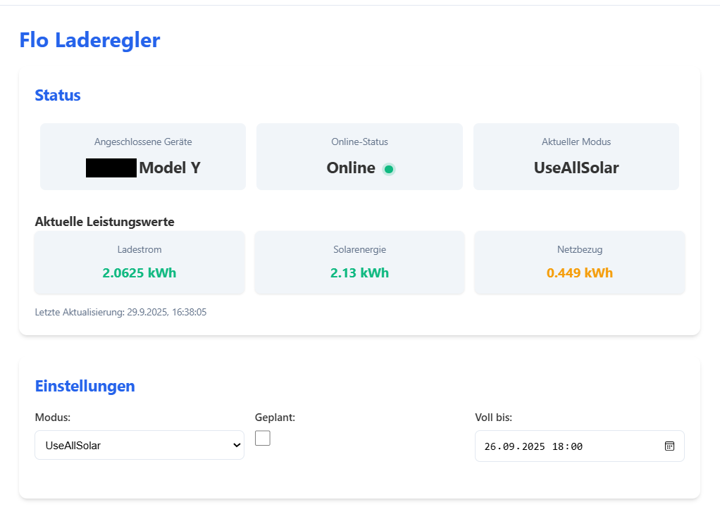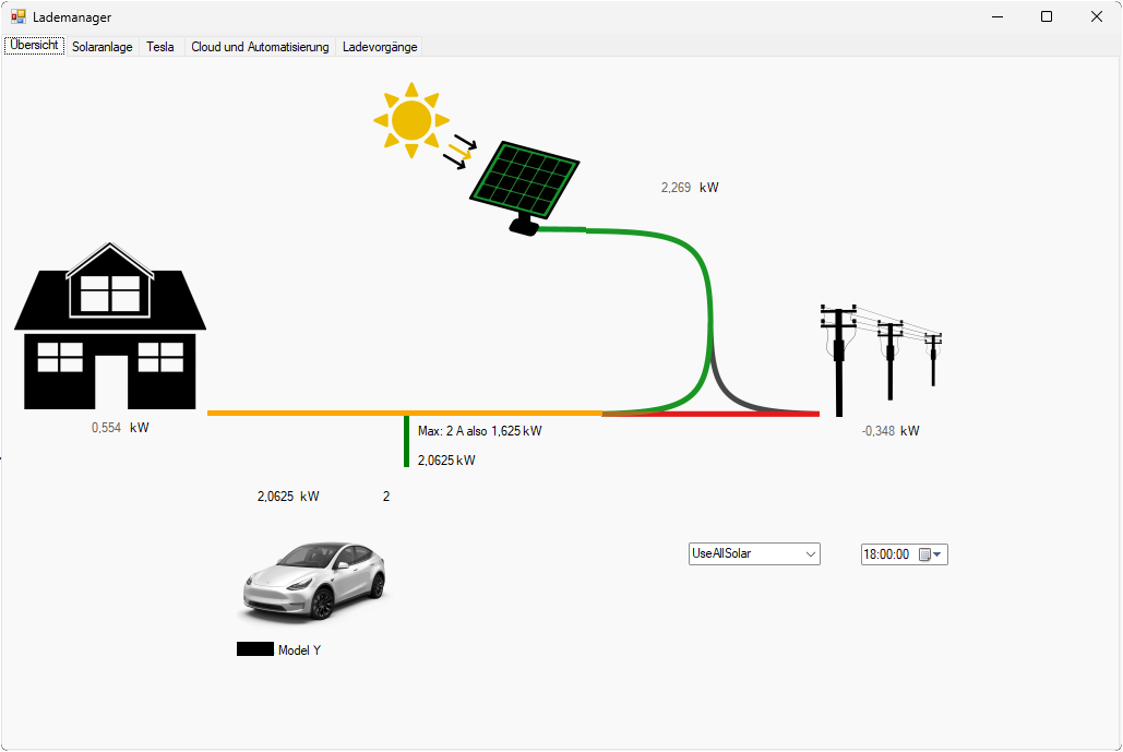 Ein Windows 11 Server-System, das automatisch den Tesla-Ladestrom basierend auf verfügbarer Solarenergie regelt. Die Anwendung kommuniziert über die Umrichter-API mit der Solaranlage und über Tessie mit dem Tesla.